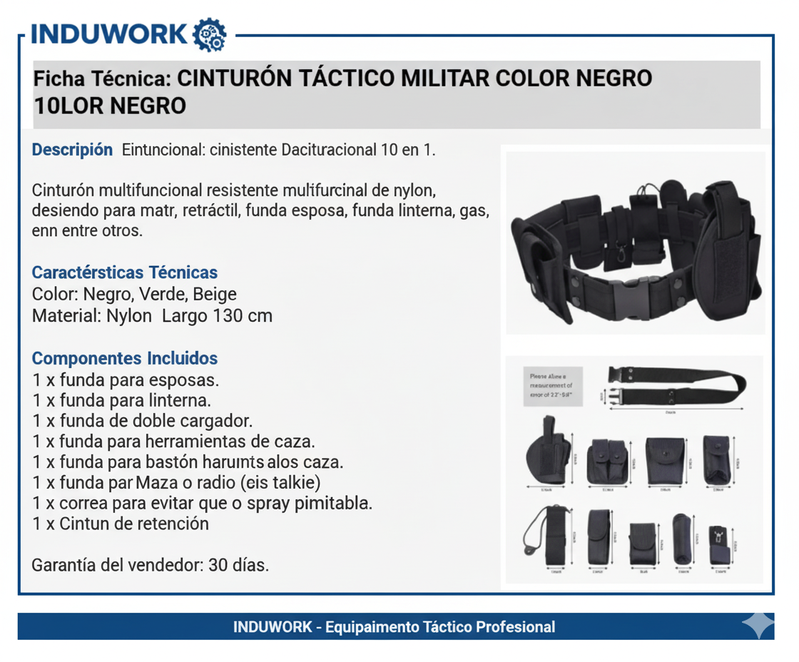 Cinturón táctico militar multipouch de 140cm, color negro, peso 850g, ancho 5cm, ajustable para cintura de 82 a 105 cm. Diseño modular versátil para agentes del orden, personal militar y entusiastas de la seguridad. Cada componente se puede mover o quitar para un cinturón totalmente personalizable. Incluye 9 bolsas multifuncionales de diferentes tamaños: funda doble de revista, bolsa para buscapersonas o móvil, funda para llaves silenciosa, funda para macana o spray de pimienta, funda para radio (walkie talkie), funda para esposas, funda para bastón extensible, funda para linterna y funda para pistola. Se sujeta con hebilla de liberación rápida, fácil de poner y quitar.
